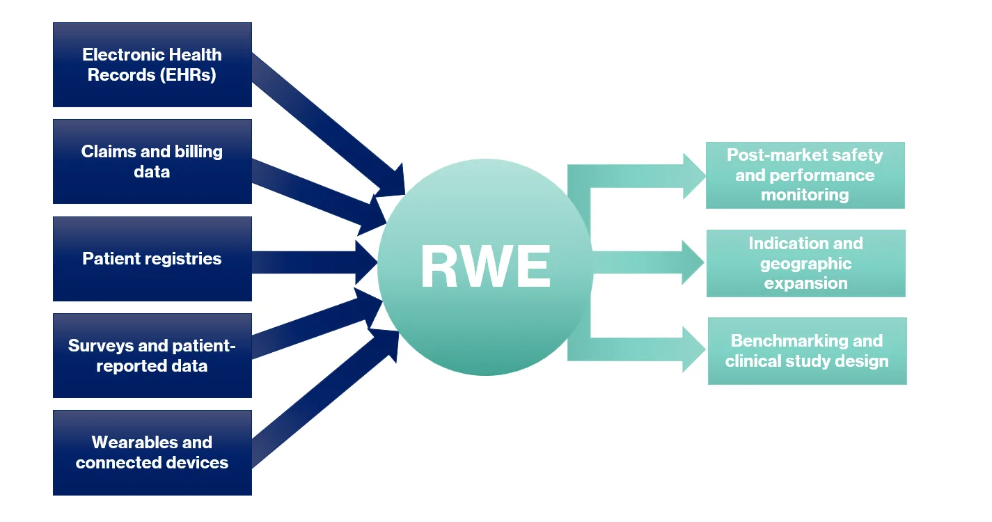 Use of RWE is not new to regulatory submissions. Historically, this evidence has been captured by retrospective chart reviews, registries, and claims data. Traditional retrospective chart reviews generate patient-level data but are limited to what is recorded during routine care, registries provide long-standing, regulator-accepted evidence but often lack device-specific linkage or complete follow-up and claims data, offers large structured datasets but rarely captures outcomes. More innovative approaches, such as survey-based chart reviews, allow healthcare providers to supply patient-level insights alongside reports of their own experience with the device. Comprehensive electronic health record datasets allow sponsors to see longitudinal outcomes across integrated systems, though linkage and access to unstructured notes remain challenges. Finally, the growing presence of wearables and connected devices allow for the creation of continuous streams of information, including patient-reported outcomes, that manufacturers can leverage with the proper consent.