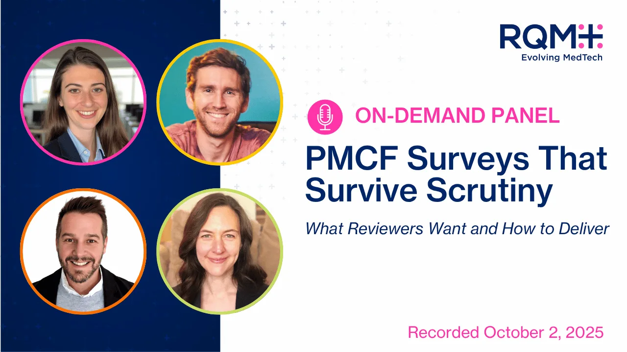 PMCF surveys can strengthen your CER and PSUR or create rework. In this 60-minute panel with live audience Q&A, RQM+ leaders from regulatory, clinical, and scientific writing share what MDR reviewers look for and how to design surveys that generate decision-grade evidence. The session is intended for regulatory affairs, post-market surveillance, clinical evidence, and medical writing leaders at MedTech manufacturers.